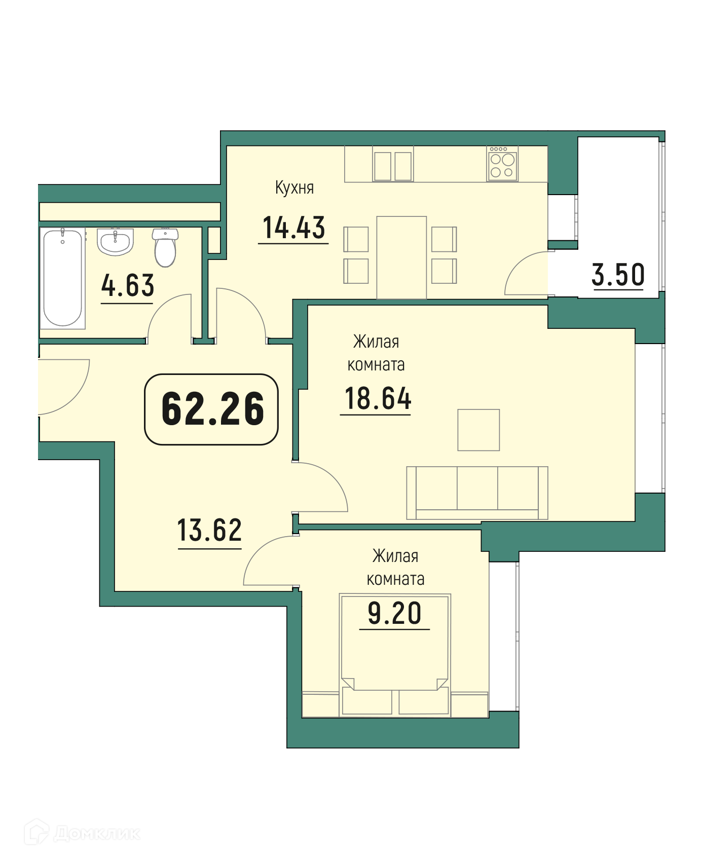Планировка 2 комн. в ЖК "Куба"