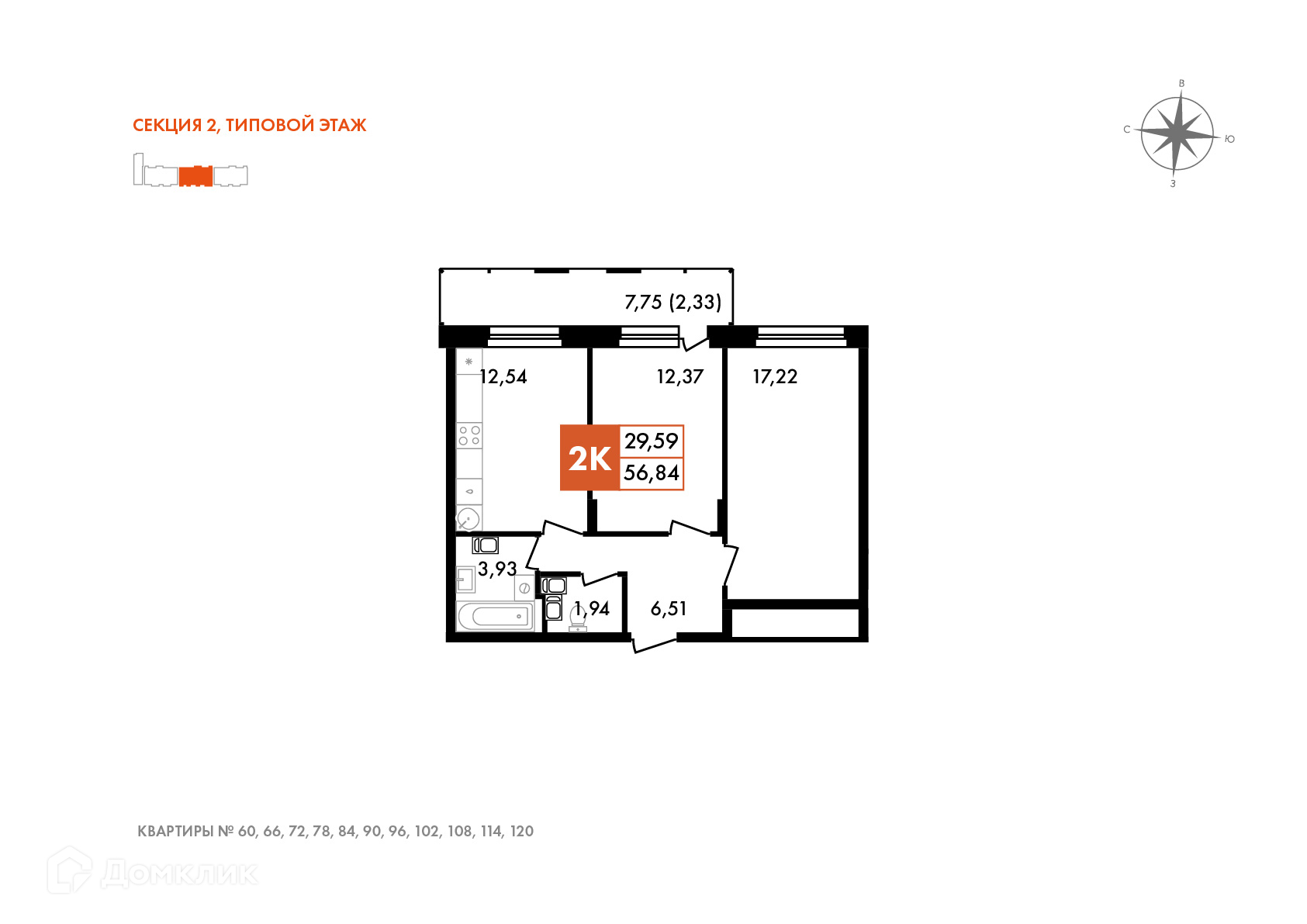 Планировка 2 комн. в ЖК Первый на Правом